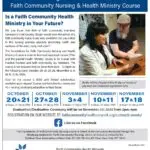 The Foundations for Faith Community Nursing and Health Ministry Course is open to licensed registered nurses (RNs) and the parallel Health Ministry course is for nurses with inactive licenses and faith community lay members. The course is ten sessions held on Zoom from 8am – 12:30pm on the following dates: October 20, 21, 27, 28, November 3, 4, 10, 11, 17, 18, 2025. Cost for the course is $350 with limited scholarships available upon request. Course cost includes four books and 40+ nursing continuing education contact hours.