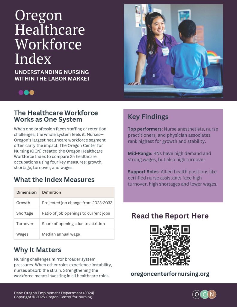 This one-page flyer summarizes the key findings from the Oregon Healthcare Workforce Index. It includes the full comparison table and can be shared digitally or printed for quick reference. Use it when you need the essential facts without reading the full report.