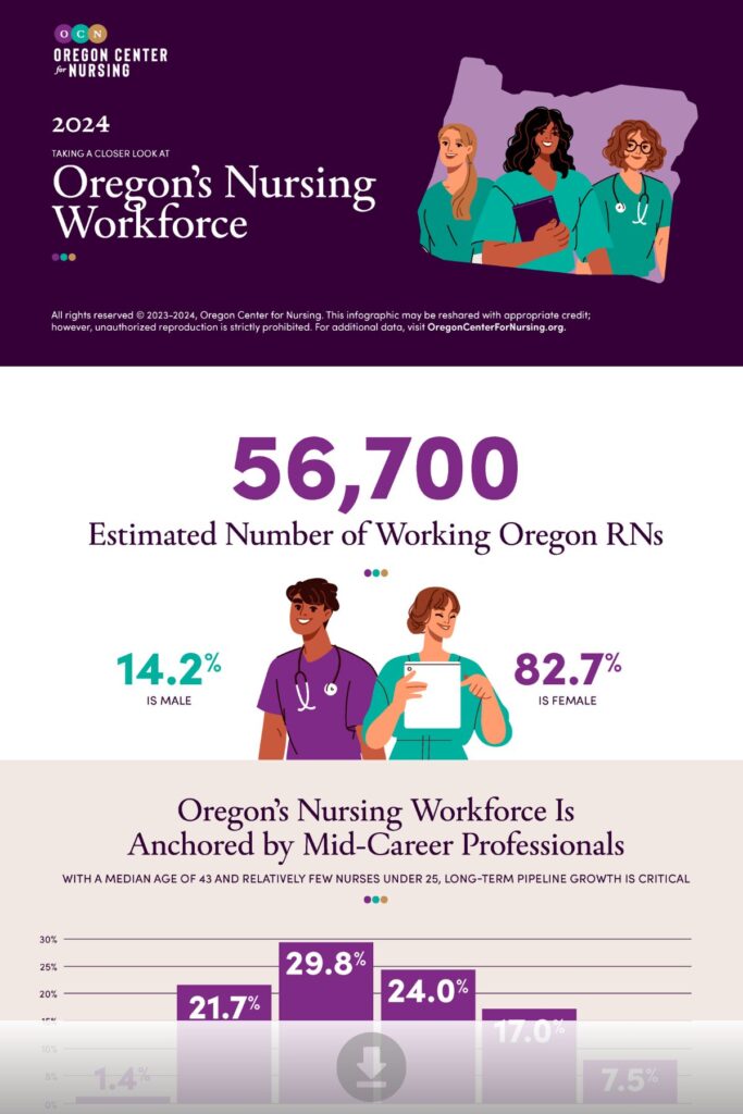 A visual overview highlights the composition, education, and practice settings of nurses across Oregonโs healthcare system. Key graphics illustrate who makes up the workforce and where care is delivered throughout the state. Designed for quick insight, the infographic offers a snapshot of nursingโs central role in Oregonโs health infrastructure.